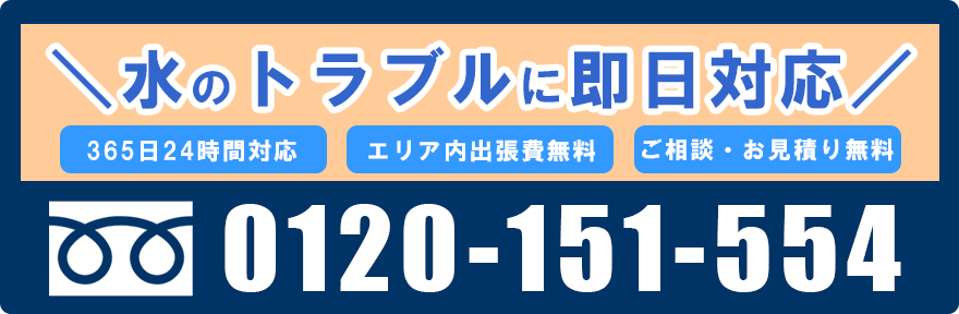 水漏れトラブルでお困りの場合は、フリーダイヤル0120-151-554までお気軽にお電話ください。オペレーターが状況をお伺いした後に、大阪市平野区の作業担当スタッフを派遣いたします。